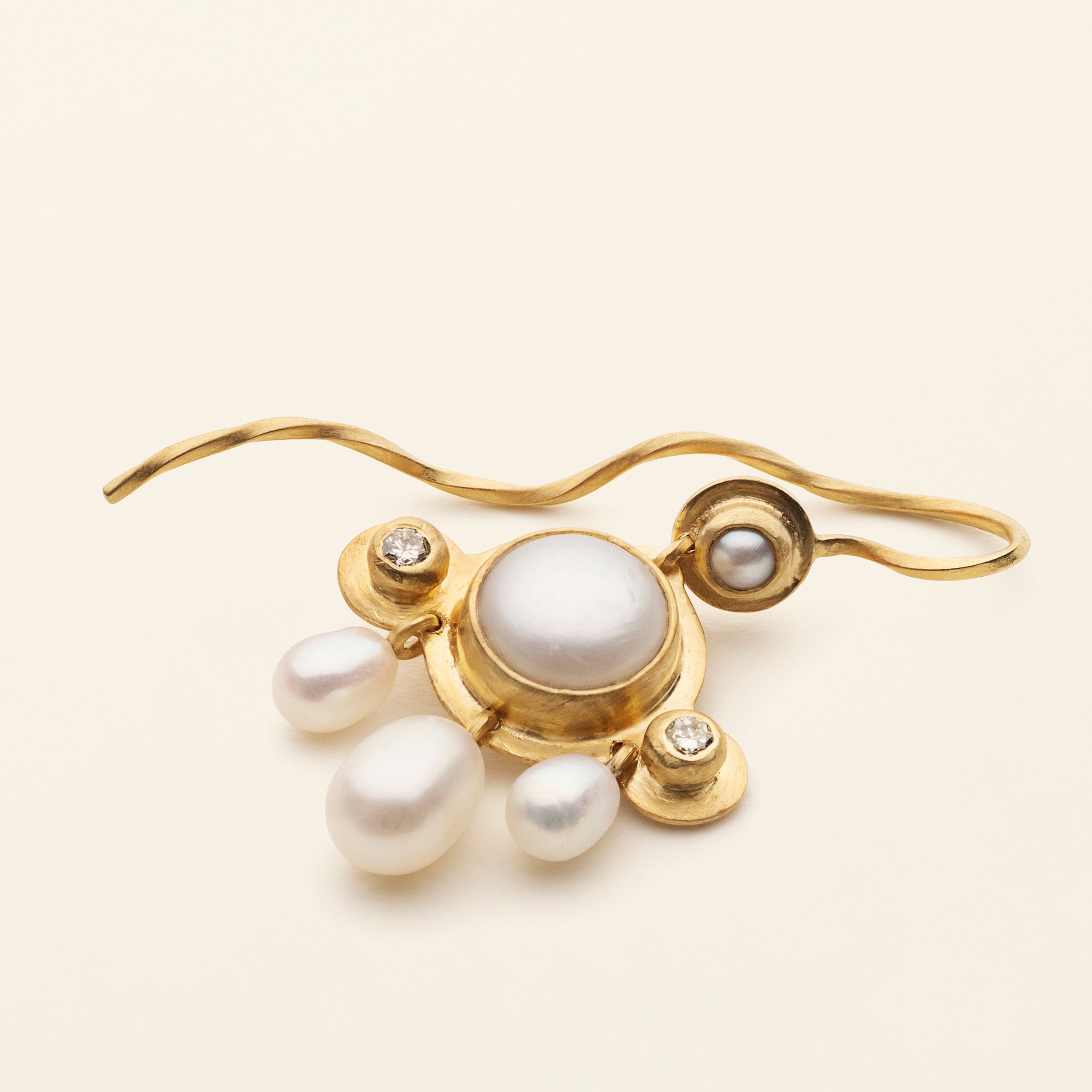 5 pearl single ørering m. diamanter i 18K forgyldt sølv. Øreringen måler ca. 3,5cm høj og ca. 2,5cm bred.