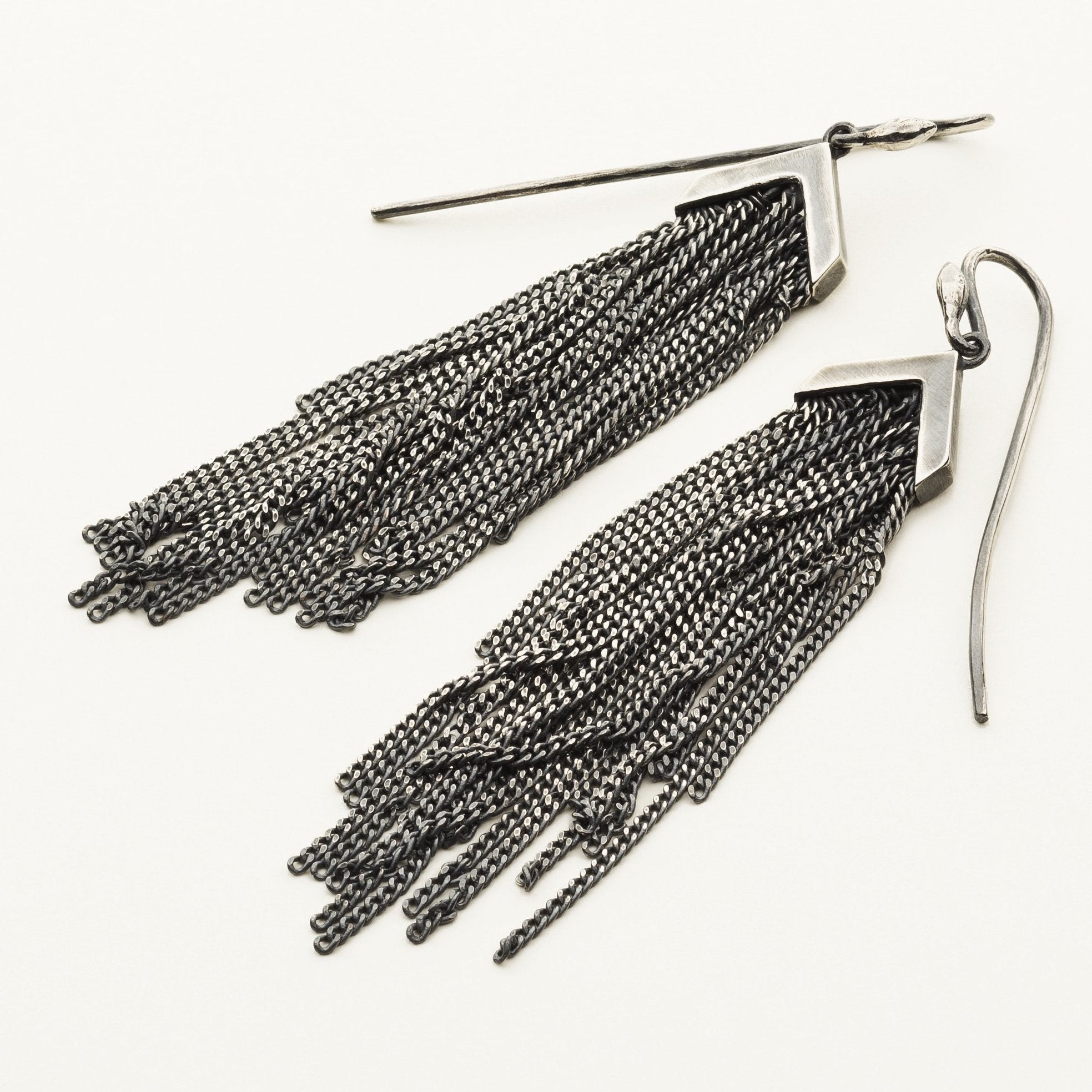 Frynseøreringe er udformet i oxideret sølv