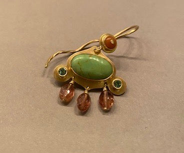 Unika 18k guld ørering med koral, tyrkis, rosa safir og turmalin dråber.
