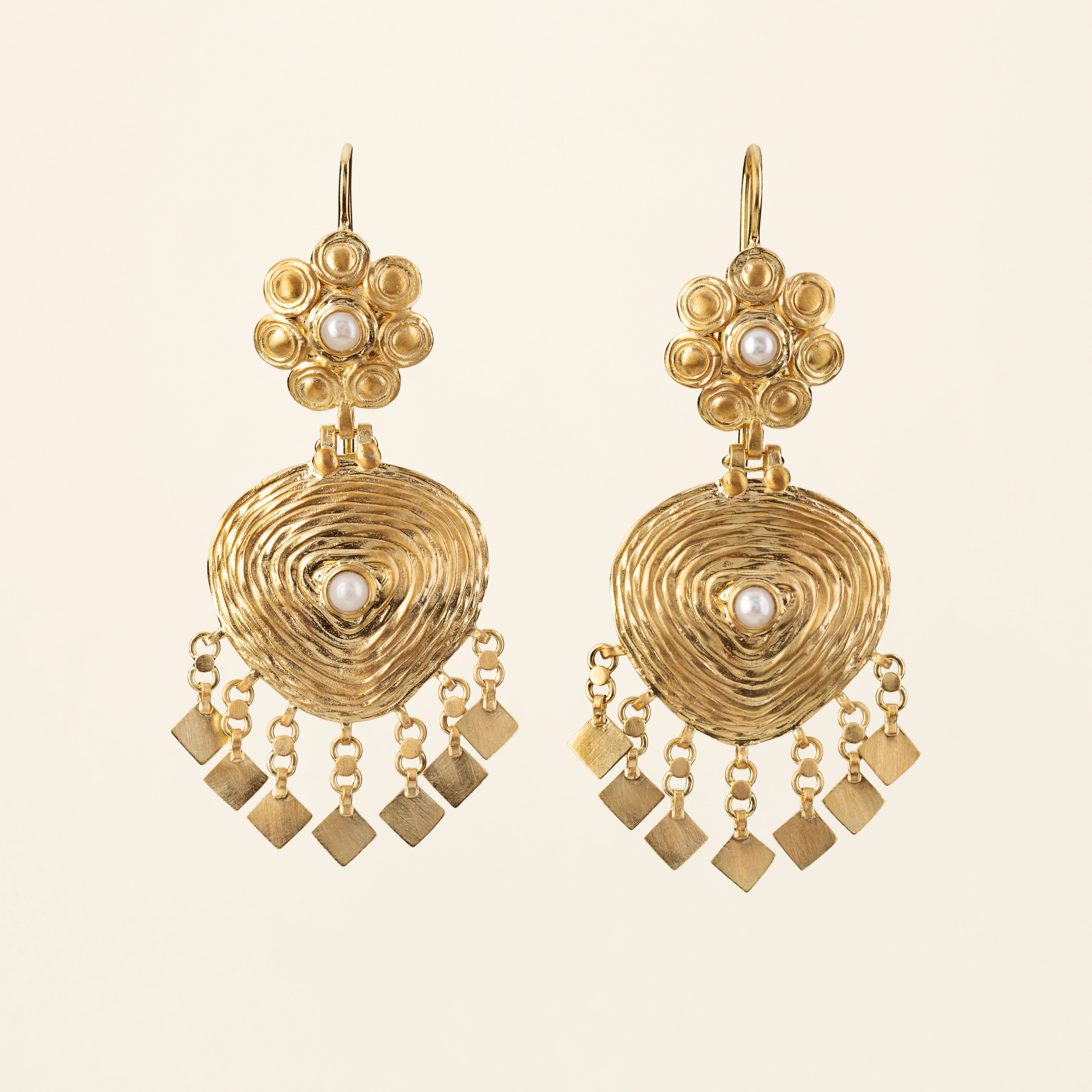 Sommer øreringe med perler i 18K forgyldt sølv. Måler 6,5cm i højden og 2,5cm i bredden.