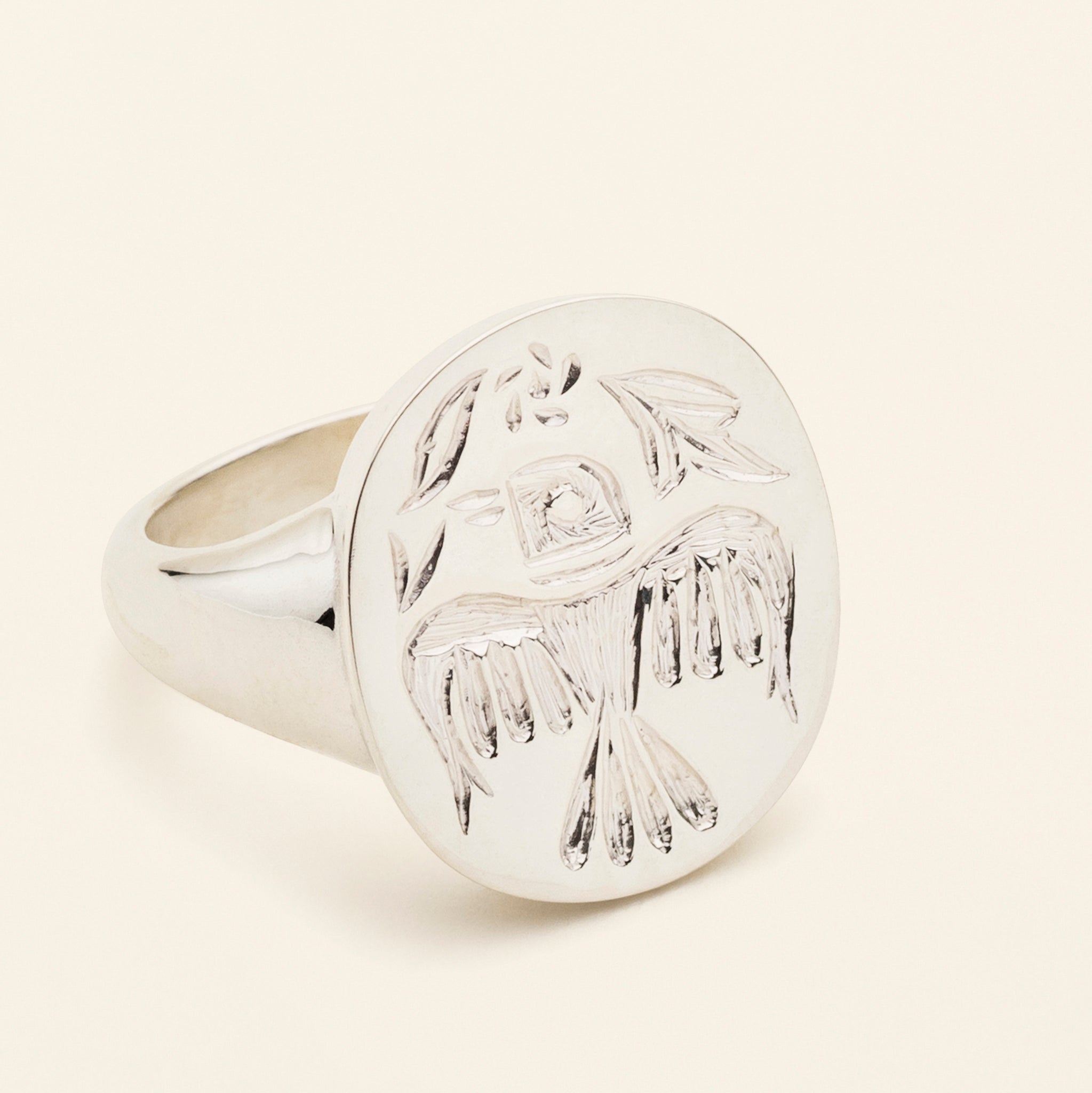 Signetring med rund front og fuglegravering i sølv. Fronten måler 1,5cm x 1,8cm. Leveringstid 5-6 uger.